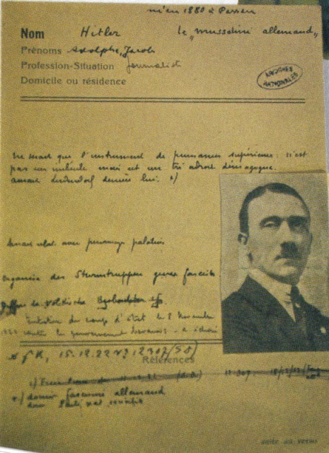 | Sur cette fiche des Renseignements Généraux que le magazine Sciences et Avenir a publié en mars 2009, on peut clairement lire le deuxième prénom d’Hitler : Jacob. |