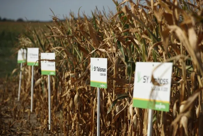 Des panneaux signalent des rangées de maïs hybrides de différentes variétés, développées par la société agroalimentaire suisse Syngenta, le 3 septembre 2018 près de Gransee, en Allemagne. Syngenta figure parmi les plus grands producteurs mondiaux de semences modifiées, le groupe a été racheté en 2017 par ChemChina. (Sean Gallup/Getty Images)