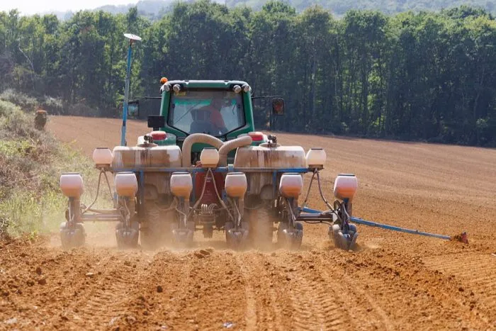 Plantation de semences de maïs avec un tracteur équipé d’un planteur ou semoir à maïs à plusieurs rangs sur la commune de Lahosse dans les Landes, le 9 juin 2025. La graine de semence tombe dur réservoir dans le sillon et plantée en profondeur et à distances régulières. Les Landes sont la 1re région productrice de maïs en France avec 29% de la surface nationale et 3,1 megatonne pour la récolte 2023/24 selon la DRAAF Nouvelle-Aquitaine. (Véronique Tournier / Hans Lucas /AFP via Getty Images)