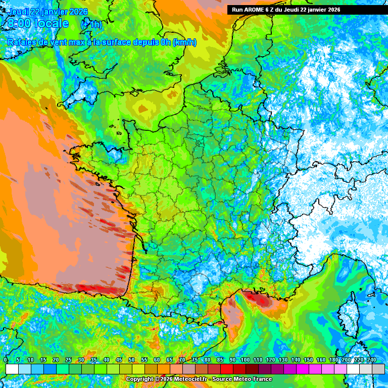 Du vent de sud à sud-ouest qui va souffler toute la journée de ce vendredi 23 janvier sur toute la côte avec de puissantes rafales, parfois jusqu’à 140-150 km/h, « entre Royan (Charente-Maritime) et Penmarch (Finistère) », selon le prévisionniste.
